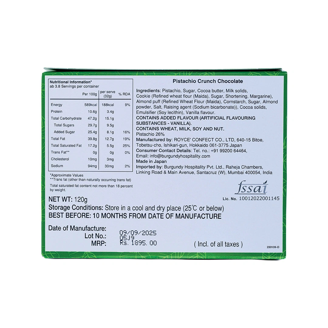 Ingredients: Pistachio, Sugar, Cocoa butter, Milk solids, Cookie (Refined wheat flour (Maida), Sugar, Shortening, Margarine), Almond puff (Refined Wheat Flour (Maida), Comstarch, Sugar, Almond powder, Salt, Raising agent (Sodium bicarbonate)), Cocoa solids, Emulsifier (Soy lecithin), Vanilla flavour