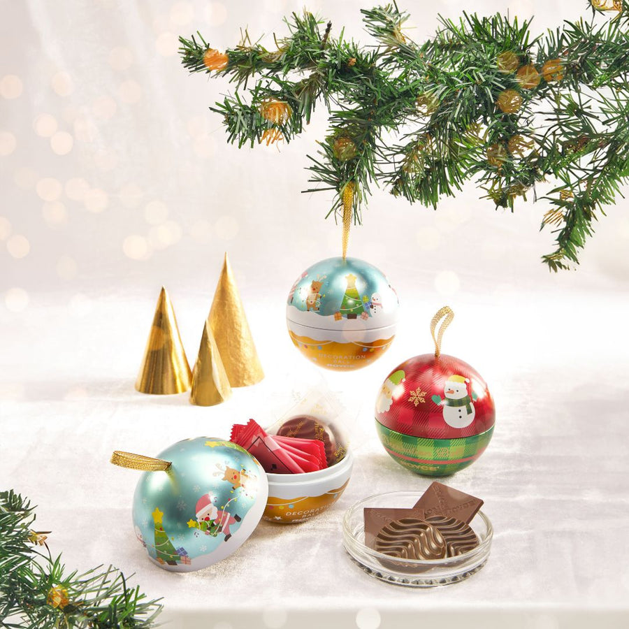 A limited edition Christmas themed tin decoration ball filled with 10 pieces of our most-popular chocolates. 5 Pcs of Pure Chocolate and 5 Pcs of Prafeuille Chocolat.