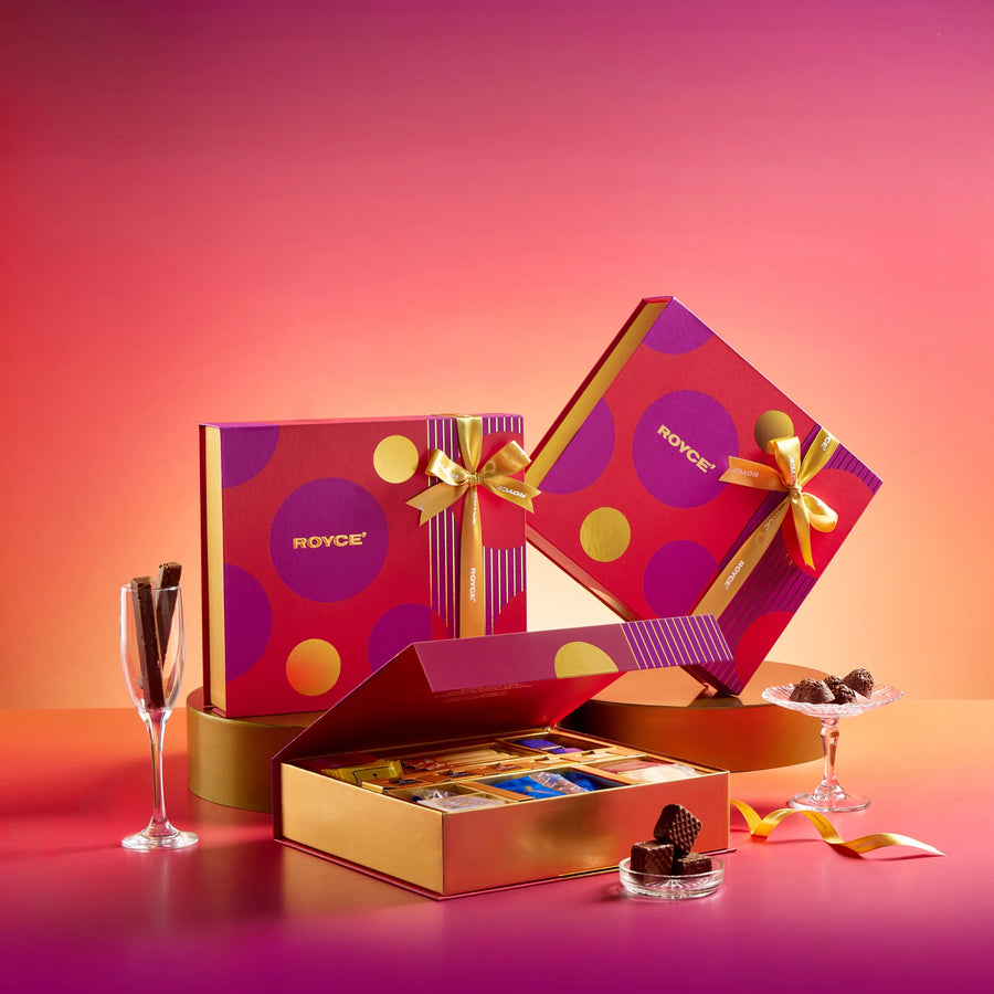 Playful yet elegant, this box of 37 chocolates is effortless in style. Inside are macadamias coated in milk chocolate, caramel-filled squares, and more.