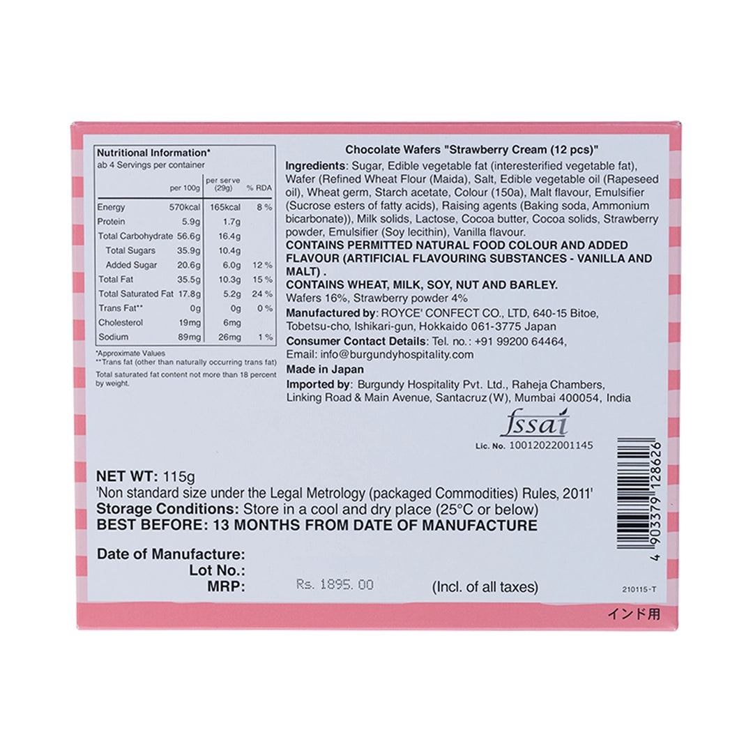 Deliciously fragrant and crispy, the Chocolate Wafers Strawberry Cream by ROYCE' Chocolate India is made with strawberry cream sandwiched between crispy wafers, coated with milk chocolate.