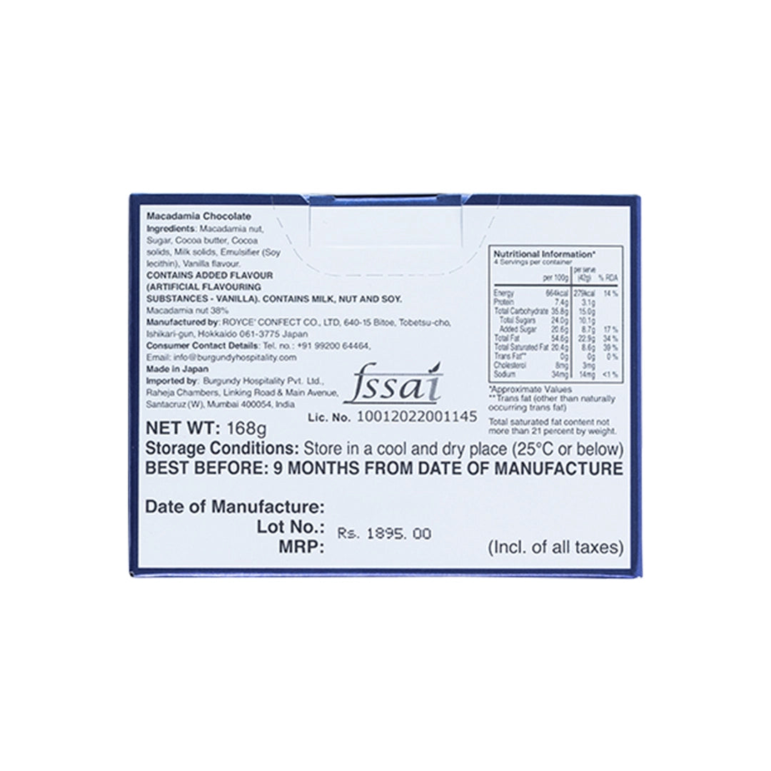 Indulge in Macadamia Chocolate by ROYCE' Chocolate India. Savory macadamia nuts coated with milk chocolate and sprinkled with cocoa powder.