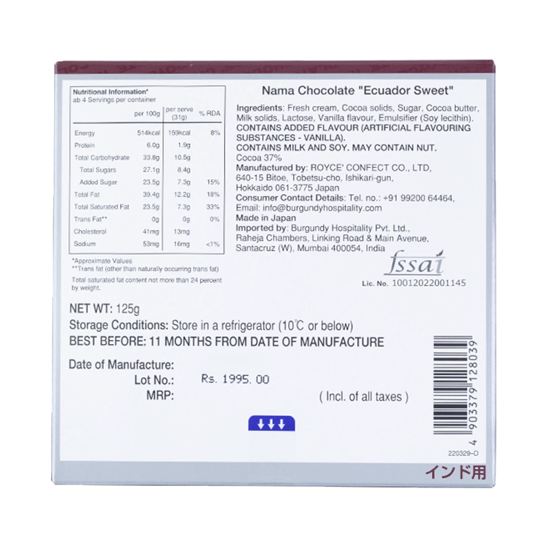 Mildly sweet and aromatic, the Nama Ecuador Sweet by ROYCE' Chocolate India is a liquor-free rich Nama Chocolate. It is made using cacao beans from Ecuador, that have their own distinct floral flavour and sweet aroma.