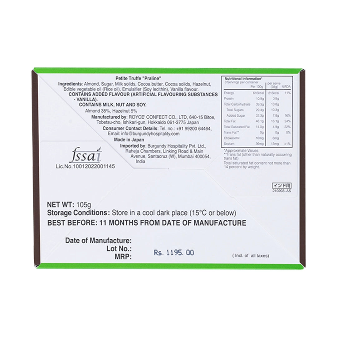 Nutty chocolate truffles made using soft chocolate ganache, blended with almond and hazelnut cream and coated with crushed almonds. Try the Petite Truffe Praline by ROYCE' Chocolate India.