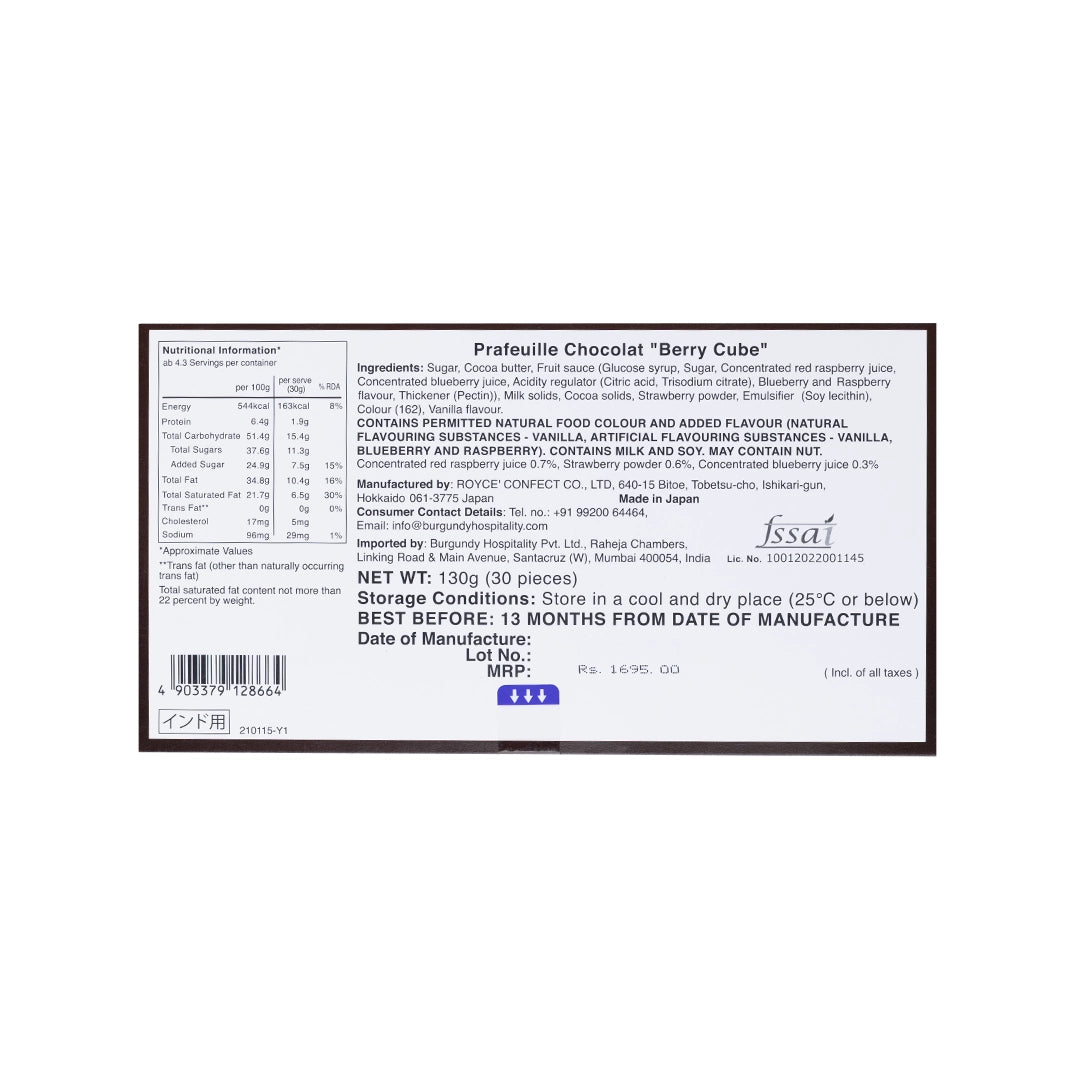 Indulge in Prafeuille Berry Cube - thin, delicate chocolate squares by ROYCE' Chocolate India. These are luxurious strawberry-scented milk chocolate squares, filled with a sweet raspberry and blueberry sauce.