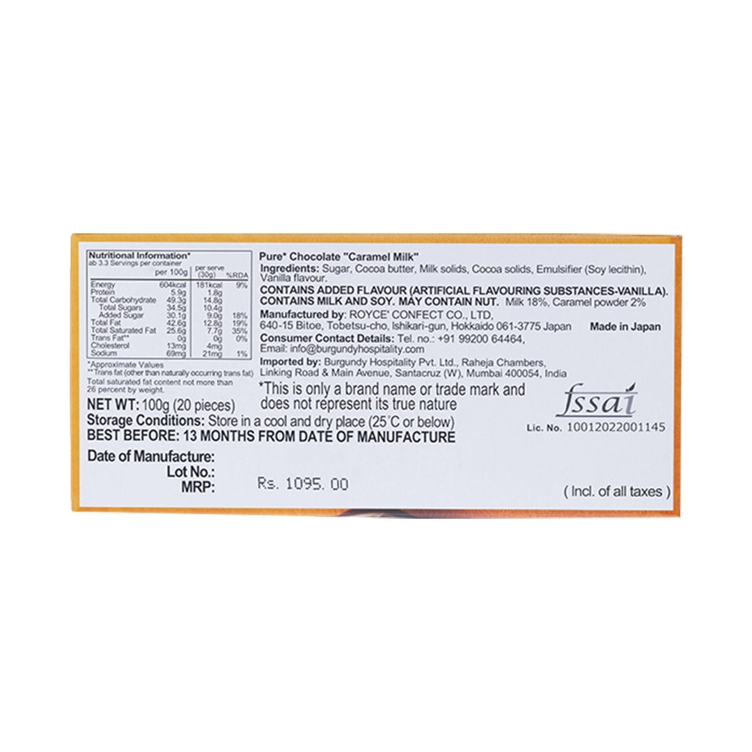 Buy Pure Chocolate Caramel Milk by ROYCE' Chocolate India, a mild milk chocolate made with fresh Hokkaido milk from Japan. Each Pure Chocolate disc has been crafted to give a specific texture, weight and shape; to enhance the aroma and flavour of the chocolate.