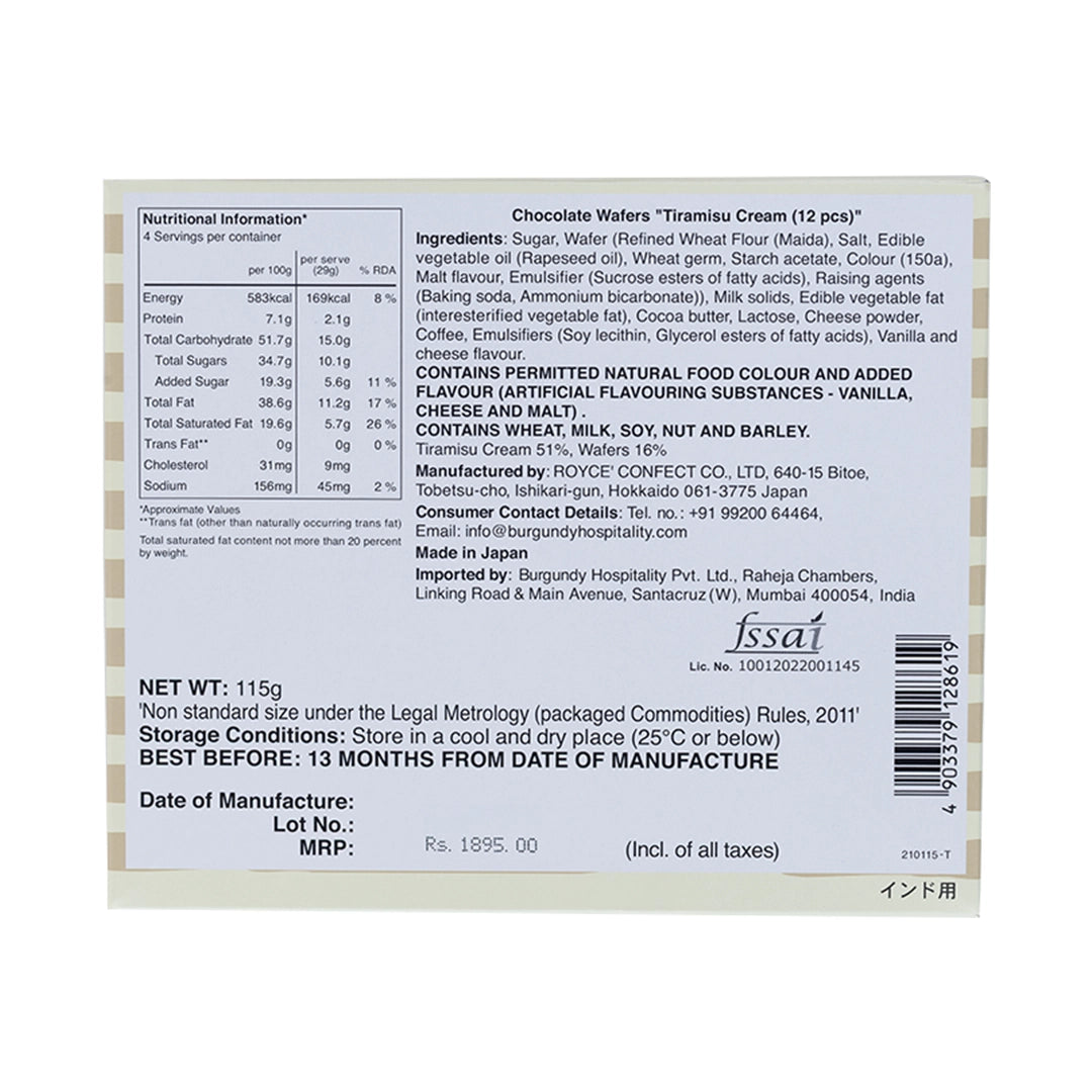 An ode to tiramisu by ROYCE' Chocolate India. The Chocolate Wafers Tiramisu is an elegant harmony of coffee and mascarpone cream cheese wafers, coated with moderately sweet white chocolate.